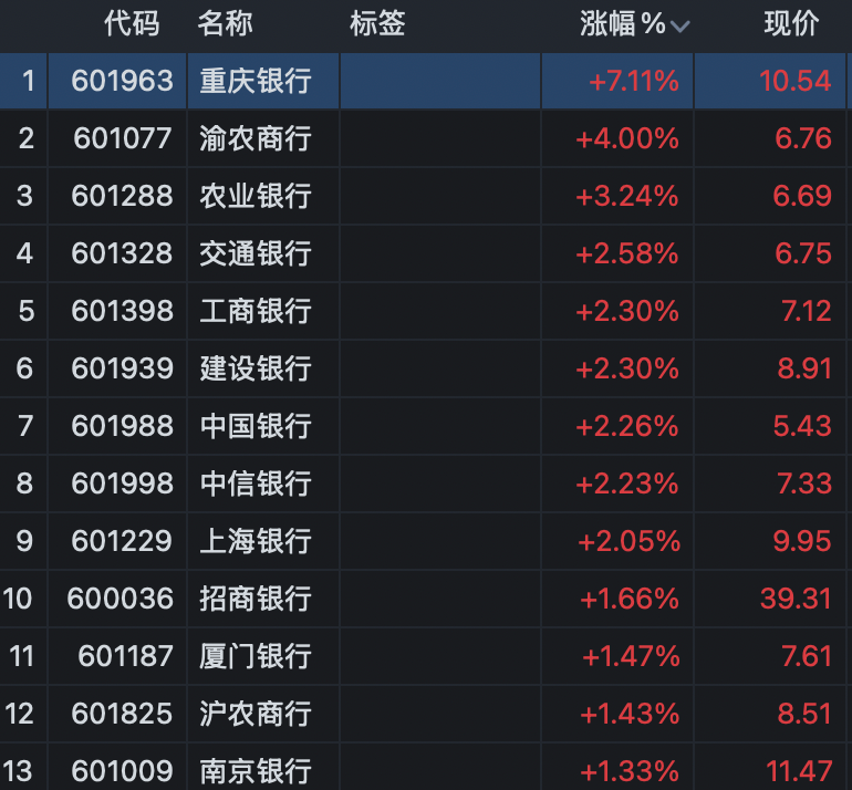 网财经讯 3月3日,银行板块逆势上扬。截至午盘,重庆银行上涨7.11%。国有行集体跟涨,其中农行上涨3.24%,交行、工行、建行、中行涨幅超2%。