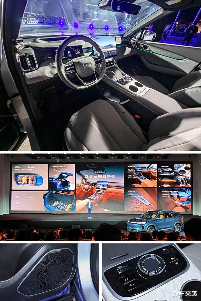 内饰方面,大尺寸悬浮式中控大屏代替了大部分物理按键,同时还拥有全液晶仪表盘和大面积无线充电板等新能源标配。值得一提的是,根据官方透露,吉利银河M7内饰的软包面积达到了82%,生态麂皮材质更覆盖44.7%,不得不承认,大量高级质感的加持会提升不少性价比优势。除此以外,新车还配备了千里浩瀚辅助驾驶H3方案、哨兵模式、座椅加热/通风/按摩、23扬声器品牌音响以及256色氛围灯等诸多豪华配置。